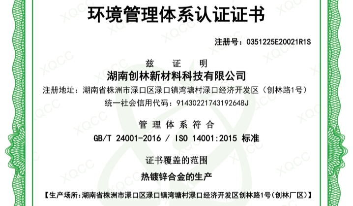 環(huán)境管理體系認證證書